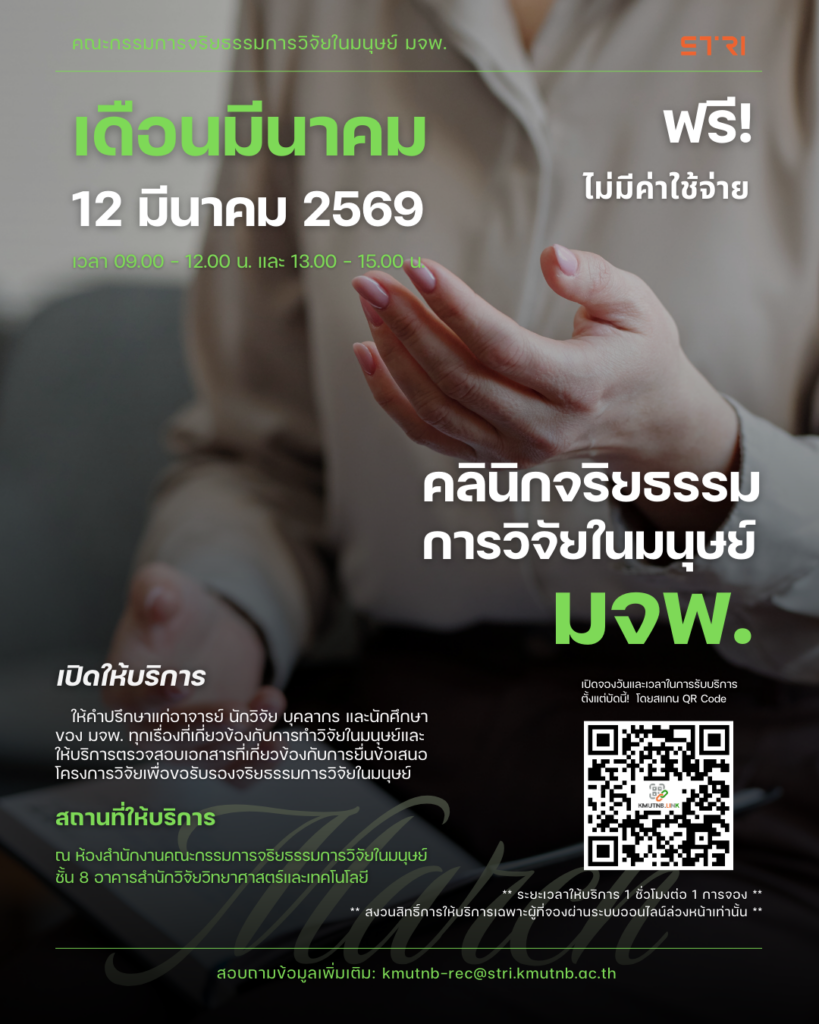 ขอเชิญเข้าร่วมอบรมเชิงปฏิบัติการ เรื่อง หลักจริยธรรมการวิจัยในมนุษย์เบื้องต้น ประจำปี 2569 ครั้งที่ 2